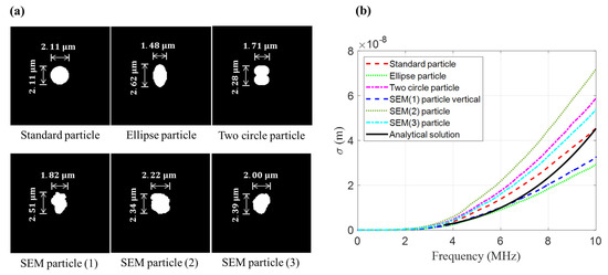 The effects of varying particle shapes on the total scattering cross-section were investigated by considering six different particle shapes, as shown in Figure 9a. The upper three particle shapes (standard, ellipse, and two aggregated circles) were artificially designed by the authors, and the lower three particles (SEM 1 to 3) were obtained by image segmentation from scanning electron miscopy (SEM) images of actual fine dust particles. The total scattering cross-sections computed for the six particle shapes are depicted in Figure 9b along with those computed from the analytical solution (Equation (13)) with a cavity diameter of 2 μm. Figure 9b indicates that the scattering cross-section values vary significantly for the six particle shapes and are different from the analytical solution, especially at frequencies higher than 4 MHz. These results reveal that varying particle shapes can be sources of uncertainty when estimating the number density in real-world applications. Modeling the scattering cross-section as a point estimate can cause an erroneous number density estimation. Rather, we suggest the scattering cross-section as a probability distribution as an output across possible values. This approach can provide a probability distribution that enables not only the estimation of the number density but also the uncertainty quantification of the estimate.