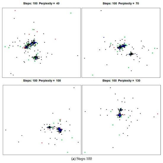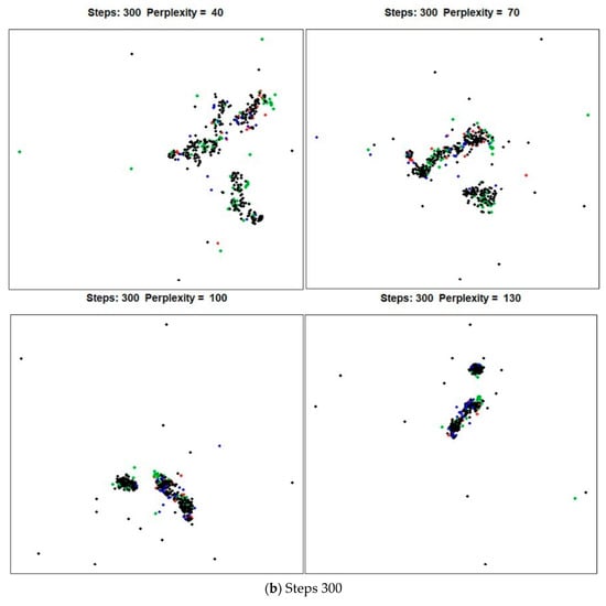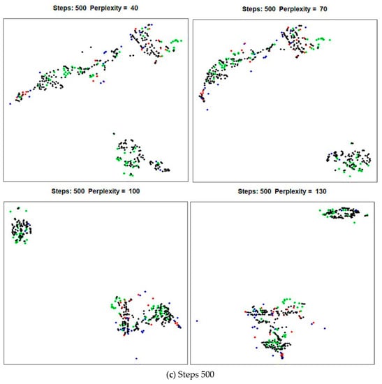 Figure 6 shows 16 different runs at four perplexity values (40, 70, 100, and 130) and four numbers of steps (100, 300, 500, and 700). Unfortunately, there is no particular number of steps that yields a stable result. Different datasets can require different numbers of iterations to converge [25]. The t-SNE algorithm adapts its notion of “distance” to regional variations in data density, and cluster set sizes do not represent actual distances. This is different from using, for instance, k-means to directly visualize the groups by designating a unique identification number to each group [2]. The coloring shows well that the map preserves the similarities within each class.