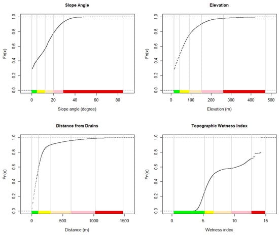 - Consistent classification: a fixed number of classes for each thematic map. All the continuous data were converted into a categorical data structure. The potential classification methods (equal interval, natural break, standard deviation, and quantile) are appropriate for different data structures and applications. In landslide research, natural breaks, which preserve the natural distribution of the histogram, including real steps or changes, are commonly used [21]. Jenks Natural Breaks (Fisher–Jenks optimization algorithm) in the R classInt package (https://github.com/r-spatial/classInt/) was used to classify the continuous data into five index classes (for consistency with other naturally categorized maps).