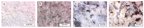 Selected rocks. Photographs made under a binocular microscope. (a) Châlons chalk (CC); (b) Fontainebleau sandstone (FS); (c) Gris Alba granite (GA); (d) Golden Ski granite (GS).