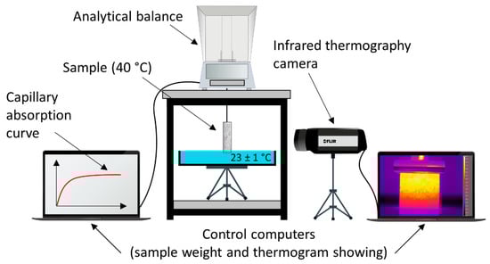 One of the two tested samples was monitored with IRT during the capillary water uptake test, that is one sample by rock type and cycle. The complete setup is shown in Figure 2.