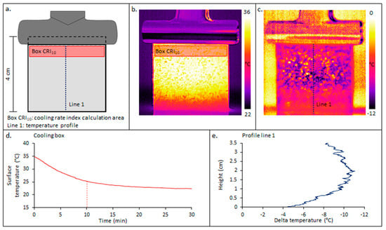 where T10 is the temperature after 10 min of cooling, T0 the initial temperature, t10 and t0 are, respectively, the times with a lapse of around 10 min. In the case of chalk, with a very fast water absorption kinetics, the CRI was calculated for the first five minutes, before the water reaches the upper half. The data used were the cooling slopes related to the square root of time. High slope values corresponded to fast cooling and low values to a slow cooling (Figure 3d).