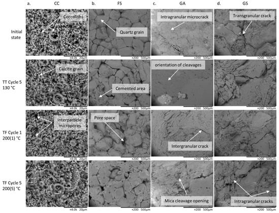 SEM observations of the Châlons chalk (a). CC, the Fontainebleau sandstone (b). FS, the Gris Alba granite (c). GA, and the Golden Ski granite (d). GS, in their initial state and after heating treatment. (TT: Thermal Threshold test and TF: Thermal Fatigue test).