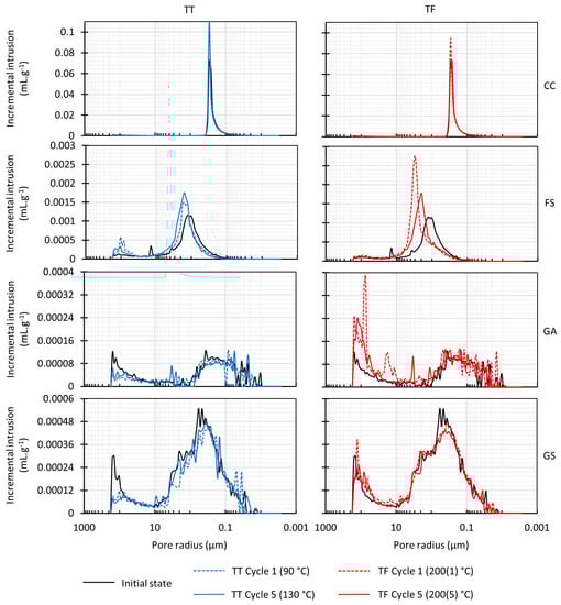 The Gris Alba granite presented an initial porosity volume of 1.05% and showed two main distributions, a wide micropore family with pore access radii below 1 µm and a mesopore family starting from around 10 µm. Through the TT, this rock showed a decrease in its pore volume of 17% at 90 °C and 25% at 130 °C. Figure 5 exhibited a redistribution and a slight reduction in the micropore family, which could be due to the heating but also to the heterogeneity between the samples. Nevertheless, there was a clear decrease in the mesoporous family for all the heating cycles. The TF test showed a great increase in the porosity, with 51% after the first cycle and 32% at the end. The microporous family exhibited a variation in the radii access proportion, without being possible to determine an increase or decrease graphically. A great increase in the pore access radii larger than 1 µm was measured, with the apparition of new peaks and the development of voids around 100 µm.