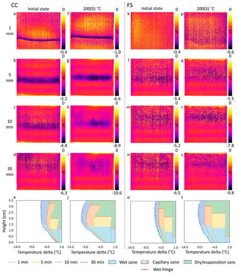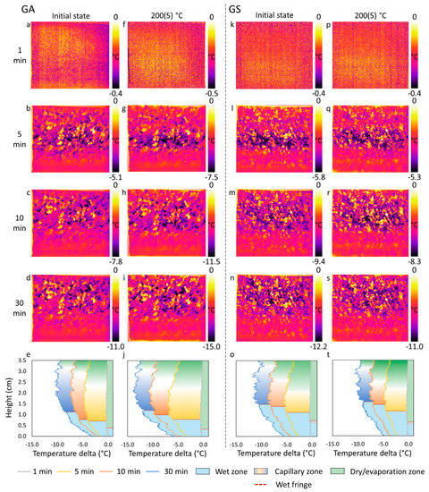 The Golden Ski granite exhibited a comparable behaviour to GA, with a homogeneous cooling during the first minute (Figure 7k). The wet zone was established approximately at the same height at 5 min and slightly higher at 10 and 30 min, also in agreement with visual observations. The capillary zone migrated to the top of the sample. At the end of TT and the TF test (Figure 7p–t), the trend was the same, with a similar differential mineral cooling.