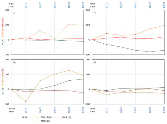 Capillary coefficient (C) (g·m−2·s−1/2) before and after heat treatments (in blue, values lower than the initial values, in red, values higher than the initial values).