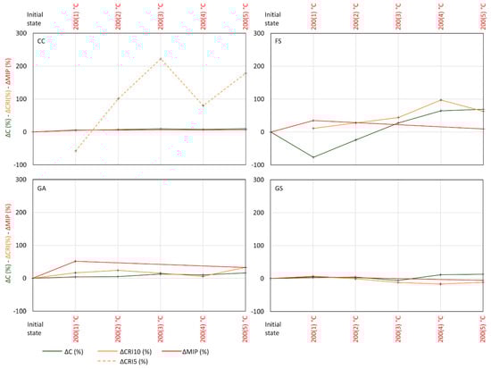 For the Gris Alba granite, the initial C coefficients were between 2.2 and 5.5 g·m−2·s−1/2 for the two samples tested. During the TT test, only the first sample showed an evident change, with a progressive increase that finished with porosity 69% higher at the end of the experiment. The other sample fluctuated slightly without being considered significant. In the TF test, this rock hardly showed any variation for both samples, with only a slight increase of 15% for one of them at the end of the test.