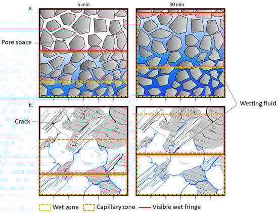 The wet fringe was observed and measured by the naked eye during the capillary test. IRT allowed us to observe and quantify not only the wet fringe but also the water distribution within the outer layers of the studied stones. The main fact extracted from the IRT images was that porous and fissural rocks behaved differently. In both cases, three zones were defined (Figure 6 and Figure 7):