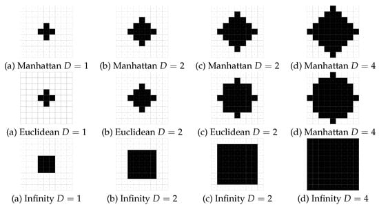Let us explain how the search of those pixels designated as noncorrupted (at least n) is implemented to restore a concrete corrupted pixel . Let and take into account the set of all the noncorrupted pixels whose distance to is . If a minimum of n non-noisy pixels are found, no more iterations are necessary and these pixels will be aggregated by using Equation (2). Otherwise, D is incremented by 1 and the search resumes. This step ends when enough non-noisy pixels are found. It is clear that the search step does depend on the considered distance. In Figure 2, the evolution of the search window for each of the distances considered in Section 4.3 is displayed.