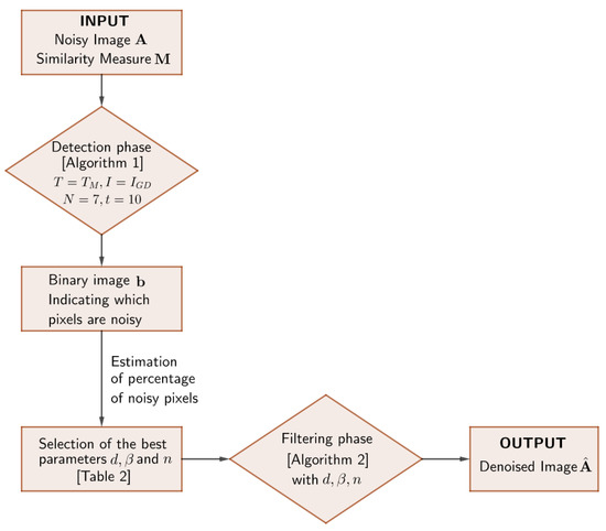 It is evident that the performance of the filter relies heavily on (i) the least quantity of non-noisy pixels considered in the aggregation function, which is denoted by n, (ii) on the exponential base of the weights, and (iii) on the considered distance, d. In Section 4.3, an in-depth analysis of the optimal values of these three parameters according to the noise level is included.
