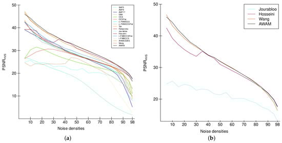 Graphical evolution of the means of the PSNR values obtained by all the filters in the test set versus noise density. (a) Complete figure. (b) Figure including only those filters that obtain the best results in general according to Table 2.