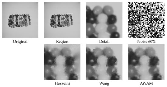 To develop this visual comparison, the Hosseini and the Wang algorithms were chosen due to their numerical performance. First, Figure 6 shows the results of these filtering algorithms for the image 7.1.02.tiff (which is an aerial photograph of a plane in a hanger) that has been corrupted with 20%, 40%, 60% salt-and-pepper noise. It can be observed that the Hosseini algorithm has a bad performance when the noise is 60%, obtaining as a result an image with undesirable blurred areas. Besides, the values of the PSNR are lower than the values obtained by the AWAM filter. With respect to the results of the Wang filter, they are very similar to the ones obtained by the AWAM filter. In this case, the performance of both filters is very similar.