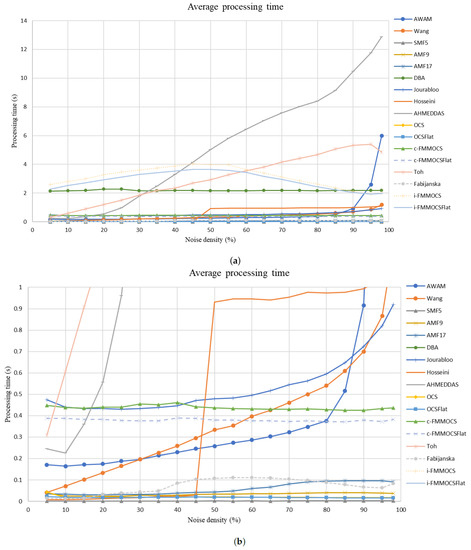 Evolution of the average computational processing times of all the filters for the images of the test set with respect to the considered noise densities. (a) Complete figure. (b) Zoomed figure for processing times less than 1 s.