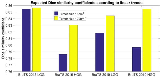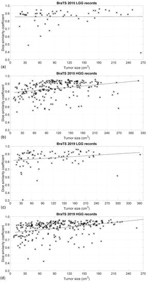 This study uses the MICCAI BraTS training data sets, both low- and high-grade glioma volumes for the years 2015 and 2019. Some main attributes of these data sets are exhibited in Table 1. Only one out of these four data sets is used at a time, so in any scenario, the total number n ρ of involved records varies between 54 and 259, as indicated in the first row of the table.