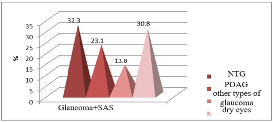 Within the studied group, patients with mild or moderate primary open-angle glaucoma, with moderate or severe dry-eye syndrome, patients with floppy-eyelid syndrome, an optical non-arteritic ischemic neuropathy case, and a patient with retinal central vein occlusion were identified. No case of keratoconus or central serous chorioretinopathy was identified. Of all the patients with SAS (N = 65), 64.6% had mild airflow obstruction, and 7.7% severe mixed syndrome. Severe mixed apnea syndrome was found only in males, and 71.4% of the patients with average obstructive syndrome were male (p = 0.046). The age ranged from 28 to 88 years, registering a significantly lower average level in patients with severe mixed syndrome, compared to the highest average level recorded in patients with mild obstructive syndrome (53.40 vs. 67.52 years; p = 0.036). About 80% of patients with severe mixed apnea syndrome and 85.7% of patients with moderate obstructive syndrome came from urban areas, while 63.6% of patients with severe obstructive syndrome came from rural areas (p = 0.131). Among patients with sleep apnea, 32.3% were experiencing NTG (normal tension glaucoma), 23.1% POAG (primary open-angle glaucoma) and 30.8% dry-eye syndrome (Figure 1). Comparing the percentage distributions of sleep apnea syndrome by types of glaucoma, the following aspects were highlighted:
