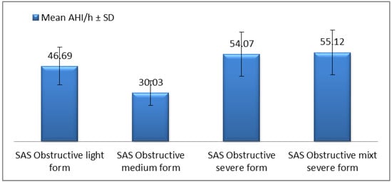 Distribution of the AHI/h ratio by types of SAS. Mean AHI/h +/− SD (standard deviation) is higher in patients with severe sleep apnea syndrome as shown in Table 1.
