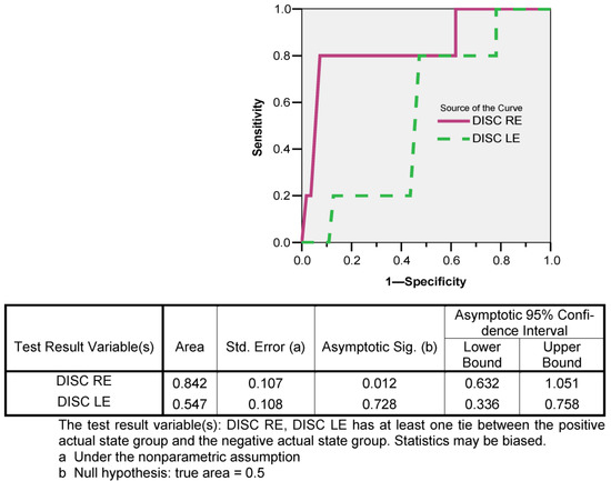 ROC Curve. Severe SAS dependent variable. Predictor of optic disk area. DISC RE and DISC LE represent the disc area measured by ocular computer tomography on each eye separately (right eye and left eye).