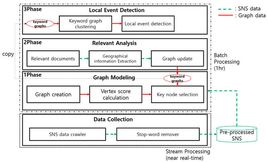 Figure 1 shows an overall architecture of the proposed local event detection scheme. The proposed scheme consists of four modules: data collection, graph modeling, relevant analysis, and local event detection. Between each module, the collected SNS data and graph data generated by the proposed scheme are transmitted. The green dotted line represents the transmission of the SNS data, while the red solid line represents the graph data. The data collection module collects and stores SNS data. It removes stop words and extracts nouns from the collected data. After the data collection, we perform a local event detection algorithm in sequence through three phases, namely graph modeling, relevant analysis, and local event detection. The first phase, the graph modeling module, constructs keyword graphs through the preprocessed data and the preconstructed geographical dictionary in the data collection module. The vertex in the keyword graph represents an extracted keyword, and the edge in the keyword graph represents co-occurrence information. We use geo-tags as much as possible, and if users do not provide geo-tags, we extract regional keywords through text mining algorithms and a geographical dictionary. After that, the graph modeling module assigns keyword type (keyword, regional keyword) to each vertex of the keyword graph. The graph modeling module allocates weights to vertices and edges to calculate vertex scores by using constructed keyword graphs. Finally, the key node selection is performed by utilizing calculated vertex scores. In the second phase, the relevant analysis module updates the keyword graph by analyzing relevant documents such as comments and threads that occur within a particular time window, which we set as 1 h. The relevant documents are continuously collected from the data collection module. The data collection module also removes stop words from the collected relevant documents. The relevant analysis module extracts geographical information from preprocessed relevant documents, and then it changes the keyword graph constructed from the graph modeling module by using extracted geographical information. In the third phase, the local event detection module detects local events through the clustering algorithm and the measurement of network modularity on an hourly basis. The proposed scheme targets only Korean documents. However, this idea can be applied to any language by properly tuning the geographical dictionary and lexical analyzer to suit each language. Buzzwords are relatively common words compared to other words, so they are excluded because they cause noise in event detection. In addition, both emoticons and hashtags can be analyzed, but only the content of the tweet was analyzed in the current paper.
