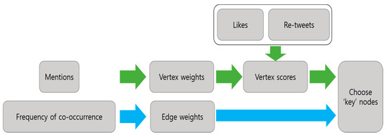 We measured vertex scores by using vertex weights and users’ explicit opinions, such as like and retweets. We can use explicit opinions as weights since posts that contain a lot of explicit opinions from other users may be more reliable and important. The vertex score can be formulated by Equation (3), where and denote the number of likes of keyword i and the number of retweets of the keyword within the particular time window t, respectively. We applied the logarithm to the sum of likes and retweets for scaling.