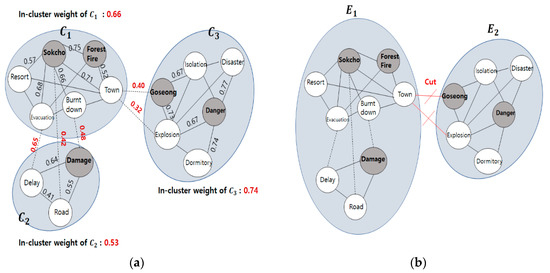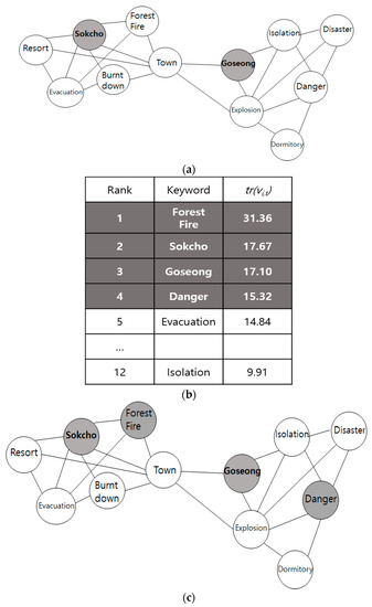 Figure 4 shows the procedure of constructing the keyword graph and choosing key nodes. We constructed the initial keyword graph based on preprocessed data as shown in Figure 4a. The locations “Sokcho” and “Goseong” are labeled as regional nodes. We calculated and assigned vertex and edge weights by using Equations (1) and (2). After that, we performed a Text-Rank analysis for the graph. First, we computed vertex scores by using Equation (3). Second, we assigned a vertex score to each vertex of the original graph. Finally, we determined the Text-Rank scores by using Equation (4). We sorted the Text-Rank scores by descending order and select top-k (k is 4 in this example) nodes (i.e., “Forest Fire”, “Sokcho”, “Goseong”, and “Danger”), as shown in Figure 4b. Finally, we obtained a graph with the key nodes as shown in Figure 4c. A graph is generated based on the tweets that occur within a given unit of time window (1 h). To distinguish events, since graph clustering is performed on a key node basis through Text-Rank based key node selection, each cluster represents one event. Therefore, related words are clustered among themselves, allowing them to be distinguished among local events.