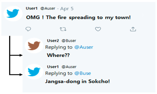 Figure 5 shows an example of relevant documents. Although the tweet of User 1 includes event information, it is difficult to determine a particular region. Region information is added through User 1′s answer to User 2′s comment. The existing schemes do not consider relevant documents, while the proposed scheme considers additional information through analyzing relevant documents for updating the keyword graph.