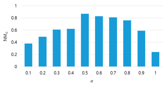 The results of the clustering depend on a threshold. Therefore, we derived an optimized value through experiments. The proposed technique considers one community (cluster) as one event in the graph. NMG is a quantitative representation of how well each cluster is separated. The higher the value is, the better the separation of events is. Therefore, we find the highest NMG value while changing the threshold value and utilize the threshold at the highest NMG for clustering. Figure 7 shows a comparison of NMG according to different thresholds. In the experiments, thresholds were assigned a value from 0.1 to 1. When the threshold is 0.1, we cannot extract important local events since the redundant keywords were contained in the event cluster. Since the threshold shows the best NMG over the other NMG when the threshold is 0.5, we set the threshold to 0.5.