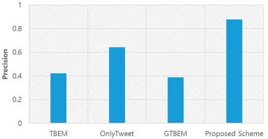 Figure 8 shows a comparison of precision according to the local event detection schemes. GTBEM and TBEM show relatively low performance (about 40%), as it is hard to derive regional information because they use only a text mining algorithm and geo-tags, respectively. GTBEM shows the lowest performance (about 38%) since it only considered geo-tags. OnlyTweet, which does not consider relevant documents, ranked second (about 65%). This means that tweets contained more regional information than geo-tagged tweets. The proposed scheme shows the best performance in terms of precision. The proposed scheme improved performance by about 20% through the relevant document analysis compared to OnlyTweet.