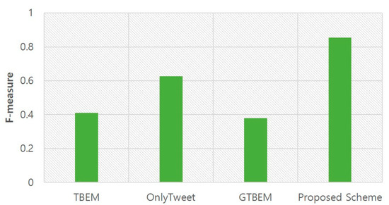 Figure 10 shows a comparison of F-measure according to the local event detection schemes. F-measure is the harmonic mean of precision and recall. Therefore, the performance results of F-measure are reasonable since the proposed scheme already achieved the highest precision and recall over the existing schemes as shown in Figure 10 and Figure 11. The F-measures of TBEM, OnlyTweet, GTBEM, and the proposed scheme achieved about 41%, 62%, 37%, and 85%, respectively. As a result, the proposed scheme achieves higher performance than the existing schemes by about 40% or more since it considers both the relevant document analysis based on text mining and geo-tagging.