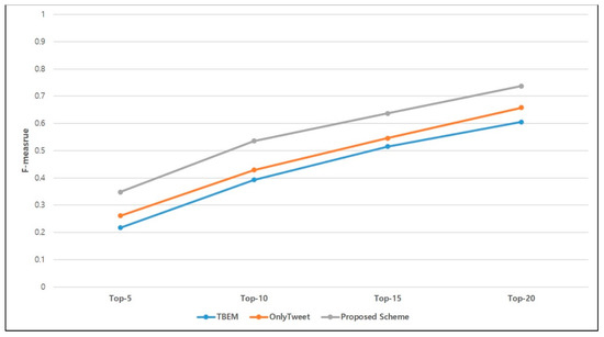 Figure 11 shows the F-measure according to the number of top-k events. When k is 20, all schemes have a high F-measure. The F-measure of TBEM, OnltyTweet, and the proposed scheme achieved about 60%, 65%, and 73%, respectively. The proposed scheme achieves higher performance than the existing schemes by about an average 10% or more when k is 20. The F-measures of all the schemes decrease as k decreases, since recall decreases as the number of detectable events decreases. Given that TBEM cannot detect regional events as it only utilizes text mining techniques, performance results are very low as k decreases. Although TBEM and OnlyTweet can provide the top 20 meaningful events, most of the results did not involve “local” events since it is hard to extract regional information precisely. As a result, the proposed scheme significantly improves the performance of the local event detection in terms of precision, recall, and F-measure.