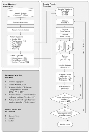 There exist many state-of-the-art machine learning approaches to detect the presence of PD at the initial stage [20,21,22]. Most of the modern machine learning techniques employ decision trees and few handfuls of approaches rely on decision forests. Though the decision trees proved to be efficient classifying acoustic voice signal data, at the same time decision forests are preferable over traditional decision trees as decision forests are more precise, accurate and able to handle overfitting and underfitting situations smartly through decision tree ensemble. Random Forest, as a random tree ensemble frequently used for Parkinson’s detection [23,24], relies on bagging approach of ensemble, which makes the decision forest versatile [25]. However, Random Forest [26] is not the only decision forest that exists in the literature. There are two recently devised approaches in data science, i.e., Systematically Developed Forests (SysFor) [27] and Forest by Penalizing Attributes (ForestPA) [28]. Many literatures suggest that the SysFor, and ForestPA are equally versatile as Random Forest. However, there is a need of describing the efficiency of decision forests in terms of tree density in the forest and a dynamic training, and testing split. In this article, three distinct Parkinson’s detection schemes have been proposed using Random Forest, SysFor, and ForestPA. The proposed schemes undertake varying tree density with incremental training and testing samples to detect the presence of Parkinson’s. The detection capability of decision forests is measured with the lowest number of decision trees they form during the process of classification to achieve maximum detection efficiency.