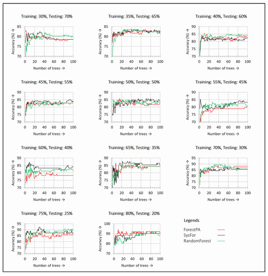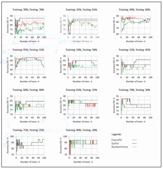 The process starts with initially splitting the data as 30% training and 70% testing. It has been observed that there is no clear-cut guideline regarding training and testing instance split. Researchers decide the training testing split according to their implementation environment and convenience [7,66,67]. On the other hand, machine learning tools like WEKA states default training testing instance split as 66%–34% [68,69]. In the absence of a concrete guideline, a loop has been created with training size of 30% and testing size of 70% to training size of 80% and testing size of 20%. In each iteration, the percentage of training size has been incremented by 5%. In each iteration of the training-testing split, the number of trees deployed has been changed from the 1 to a maximum number of trees to 100. This will give us an unbiased analysis of the decision forest for knowing the exact number of trees required to get the highest detection accuracy with the lowest number of errors. However, the main reason for setting the tree limits in the forest up to 100 is that the decision forests have different tree formation limitations. For instance, the SysFor classifier has the default number of trees is 60, whereas the ForestPA decision forest deploys 10 trees by default. Similarly, the Random Forest supports a maximum of 100 decision trees by default [68,69]. Moreover, according to Sinnott et al. [33] 100 trees are sufficient in the case of Random Forest for achieving the desired stopping criteria.