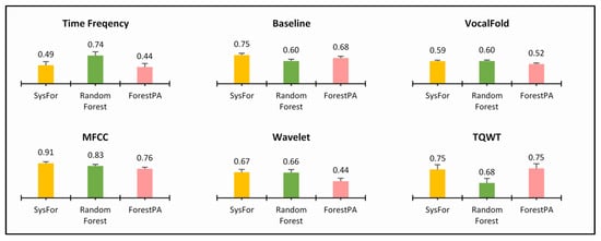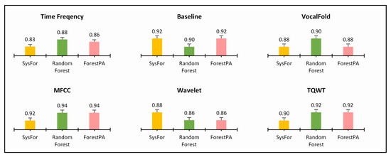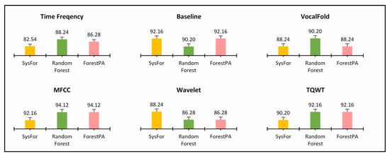 Figure 4 shows mixed results for all the decision forests. For Time Frequency, Vocal Fold, and MFCC, the Random Forest shows best detection rate. Similarly, SysFor shows better results for Wavelet feature segments. Not only this, the ForestPA revealed at par result than its peer forests in Baseline and TQWT features.