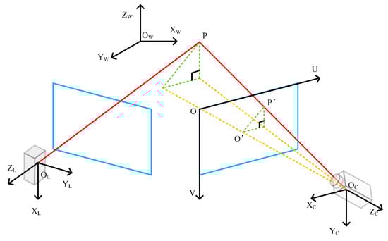 As mentioned above, we apply flash LiDAR to complete calibration of the system because of its low cost and high resolution in both the vertical and horizontal directions. Besides, flash LiDAR has a big advantage in terms of price and stability. The LiDAR emits a beam of diverging laser initiatively, and the light returns to LiDAR through optical lens on a light-sensitive chip. This process follows time of flight (TOF) theory and calculates how long it takes for the light to hit an object and reflect back to the LiDAR. Hence, the intrinsic parameters of the camera and flash LiDAR both can be demonstrated by the pinhole model, as illustrated in Figure 1. The mere difference is that the pixel value of camera refers to color information, while the pixel value of LiDAR represents distance. The basic assumption here is that the lens distortion is dismissed.