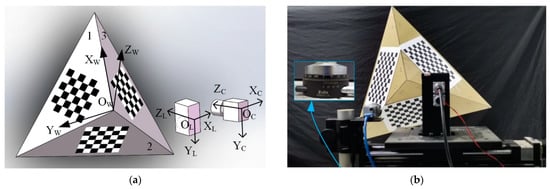 We design a triangular pyramid calibration target to complete the calibration of the camera and flash LiDAR system. The target is an arbitrary triangular pyramid with a chessboard pasted on its three planes, as shown in Figure 2a. Without knowing the size of the triangular pyramid, the only parameter to be determined is the size of the unit of the chessboard, hence the error of manufacture being ignored. In this section, the world coordinate system  is set up as follows. Origin  is the middle vertex of the triangular pyramid. Axis  is aligned with one edge of the triangular pyramid. Axis  is on plane 1, perpendicular to axis . The direction of axis  is determined by the right hand rule.