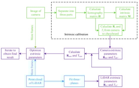 Figure 3 is a flow chart of our method to calibrate the camera and flash LiDAR system. Firstly, we turn on the camera and LiDAR to acquire image and point cloud of the triangular pyramid target simultaneously. The image of the target is divided into three parts and each part displays the image of one chessboard. Secondly, we apply the feature points correspondence method based on [] to obtain homography matrix  and intrinsic matrix  of the camera. Thirdly, we calculate rigid transformation from the chessboard to camera by combining  and  to obtain the extrinsic parameters from the world coordinate system to camera coordinate system. At the same time, we fit planes of three chessboards in the point cloud and obtain extrinsic parameters from the world coordinate system to LiDAR coordinate system. Finally, we calculate the initial extrinsic parameters from the LiDAR coordinate system to camera coordinate system, and optimize the result by minimizing the distance from the points to the chessboard. Furthermore, if we take more frames of the camera and LiDAR, the result can be more accurate by applying the Levenberg Marquardt algorithm [].