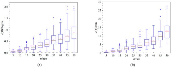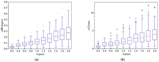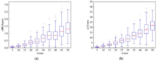 The errors of depth data during LiDAR measurement and corner points during camera measurement are primary error sources in the extrinsic calibration process. In this experiment, we explore the calibration result with respect to noise on point cloud. Zero mean Gaussian noise is added to the direction vector of LiDAR point so as to simulate real measurement. The standard deviation  of noise is changed from 0.01 m to 0.1 m. For each noise level, 300 independent tests are carried out. The absolute errors of rotation  and translation  are demonstrated in Figure 4. In the boxplot, the horizontal boundaries of the box represent the first and third quartiles, separated by the red middle line, which is the data’s median. And red points represent average absolute errors of each noise level. From Figure 4, we can observe that noise increases almost linearly with the increasing of noise level. Hence, reducing noise error of LiDAR point is an essential way to obtain an accurate calibration result. When , which is the noise level of a normal flash LiDAR, the average error of rotation is about 0.5° and the average error of translation is about 7.4 mm.