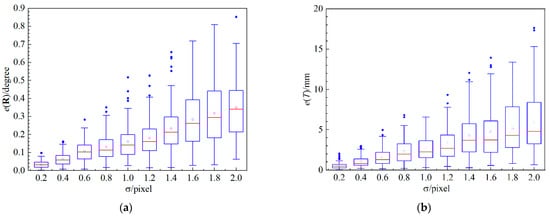 Figure 7 shows the relation of absolute errors and pixel noise level after optimization. It is clear that, after optimization, the errors of rotation and translation are both lower than initial results to some extent. In Figure 6, when , the average errors of rotation and translation are about 0.38° and 4 mm (the corresponding results in Figure 4 are 0.5° and 7.4 mm), respectively. In Figure 7, when , the average error of rotation and translation are about 0.13° and 2.2 mm (the corresponding result in Figure 5 are 0.16° and 2.7 mm), respectively. The performance means that the optimization method is effective in decreasing errors of both rotation and translation.