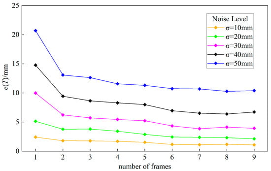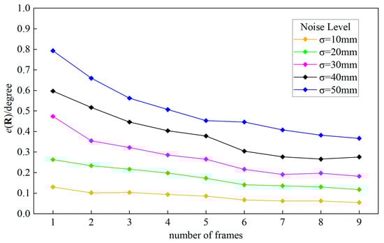 As described in Section 3.2.2, our method can calibrate the extrinsic parameters through one single capture. However, more frames of the camera and LiDAR can provide more information of the target. In this experiment, we simulate 20 frames of the camera and LiDAR, and randomly select several frames to figure out the calibration result. The number of frames varied from 1 to 9, and for each number, we conduct 300 independent tests. The noise level of pixel noise is set to , and the  of point cloud noise is set from 10 mm to 50 mm separately. Figure 8 and Figure 9 plot the average absolute errors of rotation and translation. It is shown that, as the number of frames increases, the rotation and translation errors decrease obviously. However, when there are more than six frames, the decrease in the measurement error is not obvious. So, it is wise to use a suitable number of frames to obtain a precise result.