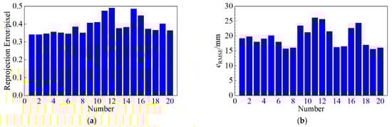 where  represents the RMSE of all points to their corresponding chessboards. We also calculate the RMSE of 20 pairs of frames, and the result is illustrated in Figure 10b. It shows that the RMSEs of most frames are under 25 mm.