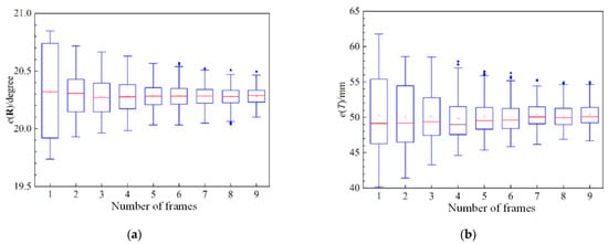 To test the performance of a different number of camera and LiDAR frames, we keep the camera and LiDAR fixed, move the triangular pyramid randomly, and take 20 pairs of frames. One to nine pairs of frames are randomly selected to calibrate the extrinsic parameters, and we conduct 100 repeated tests for each frame level, expect that 1 frame is only tested 20 times. We also use Equation (23) to describe the single angle  and translation  from LiDAR to camera. The boxplot of each number of frames is shown in Figure 11.