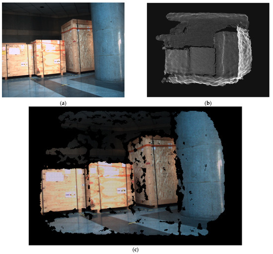 In order to test the actual effect of the proposed method, we use our calibration result to reconstruct 3D scenes. The 2D image of camera is superimposed to 3D point cloud of flash LiDAR, and the result is shown in Figure 12. As one can see in Figure 12c, the image of the camera and point cloud of LiDAR match quite well.