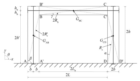 The PCRF has the connecting interfaces set at the column feet and at the vertical inner faces of the beam–column joints, allowing the columns to be uplifted with the accompanying separation of the beam–column interface and rotation of the beam and column around the interface. The theoretical model based on rigid body of a one-story single-span PCRF is shown in Figure 1, which consists of two columns, a beam and prestressing tendons. Relative slips between the rigid members on each interface are not allowed. The tendons are arranged along the centerline of the beam and columns. The connections between the beam and columns and the anchoring of columns are accomplished by prestressing the tendons. The column has a mass , height and width . Its semi-diagonal and slenderness ratios are and , respectively. The beam has a mass , height and length . Its half-diagonal length is and its height span ratio is . The inclined angle between line AB and AD is . The coordinate system and other geometric parameters are shown in Figure 1 and the clockwise rotation of the beam and column are positive. The mass centers of the columns and beam are , and .