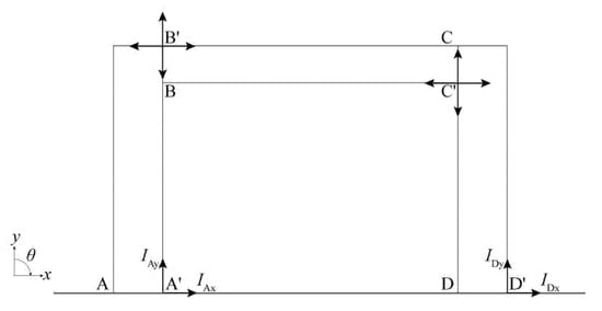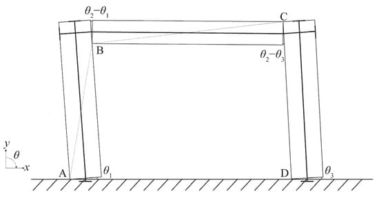 The case is taken as an example for analysis. The collision analysis model of the PCRF is shown in Figure 6 and the frame has returned to a zero-rotation state at this time. It is assumed that the angular velocity just before the collision is known of the frame column represented by bar AB. There are five unknowns: impulse and at collision point A’, and at collision point D’ and the postimpact angular velocity of the frame column represented by bar C’D’. The impulse at an arbitrary collision point i is defined as