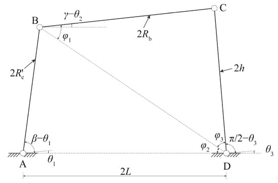 The geometrical relationship of the planar four-bar linkage mechanism for is shown in Figure 3. Firstly, is assumed as a known angle, and are calculation auxiliary angles. From the geometry relationships, we have