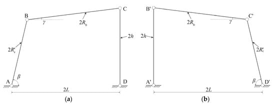 The motion law of the PCRF is the same as that for the planar four-bar linkage mechanism shown in Figure 2, Figure 3 and Figure 4 when the PCRF is rocking. The rigid body model of the PCRF is a single degree of freedom system and can be described by a generalized coordinate. The rocking mechanism and planar four-bar linkage mechanism of the PCRF during counterclockwise rotation are shown in Figure 2. The dotted lines in Figure 1 and Figure 2 are used to illustrate the four-bar mechanism presented in Figure 3 and Figure 4. Hence, the planar four-bar linkage model can be used to obtain the relationship between the angles of the beam and columns. That is, the motion of the columns and beam when the PCRF is rocking can be represented by the motion of the bars in the four-bar linkage model. The governing equation of motion of the PCRF can be derived by the Lagrangian equation method. The angles of rotation of bars AB, BC and CD are denoted as , and , respectively. Figure 4 illustrates the planar four-bar model for the case and the case . The angle is positive and is negative in the case , while the opposite is positive for the case .