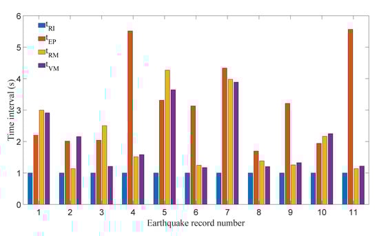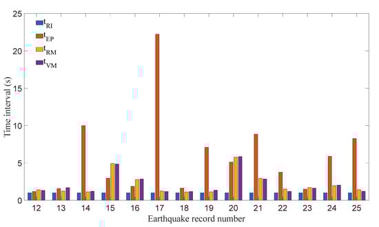 In order to investigate the relationship between the key time points , , and of the basic model under different earthquakes, the of each response are all set as 1 s. The corresponding unified key time points can be obtained. The unified key time points of far-field and near-field earthquake records are shown in Figure 9 and Figure 10, respectively.
