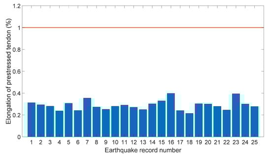 The maximum elongations of prestressed tendons can be calculated based on the maximum rotation of the PCRF, as shown in Figure 11. It can be observed from Figure 11 that the maximum elongations of prestressed tendons are less than 0.5%, which have a large surplus from the 1% value of the fracture elongation of prestressed tendons. That is to say, the reserve of deformation capacity is sufficient and the seismic performance of the PCRF is prominent. It is worth emphasizing that the member connections of the PCRF proposed in this study depend mainly on the prestressed tendons and prestressing forces. Therefore, the structure failure of the PCRF will be led by the fracture of the prestressed tendons. Special attention should be given to the calculation of the deformation and elongation of prestressed tendons in analysis and design.