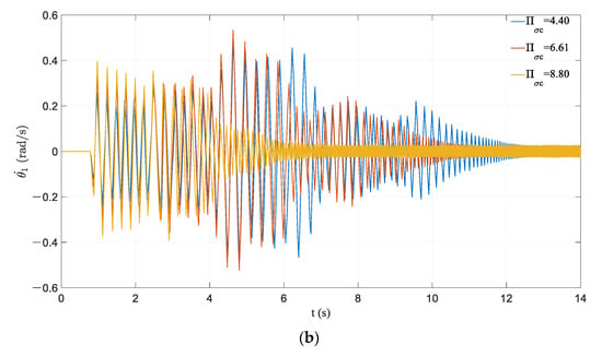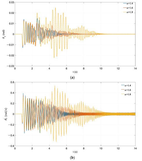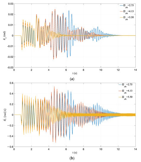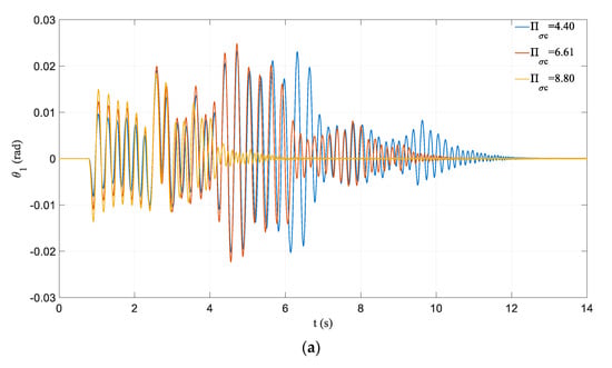 A frame with a larger has a smaller response in the early stage of vibration, as shown in Figure 12. However, the responses of the frame are changed dramatically with the emergence of a large acceleration pulse at 2~3 s. In the meantime, the frame with a larger has a significantly larger angle and angular velocity compared with the smaller ones. A number of acceleration pulses appeared around 4 s, which increase the responses of the frame with further. The other frames have a smaller rotation before encountering multiple acceleration pulses and the amplification effect of multiple acceleration pulses on their response is limited. Different frames with different got into the pseudo-steady-state vibration eventually, while the frames with smaller entered earlier.