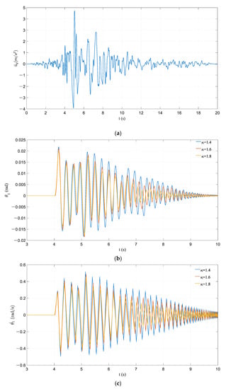 It can be found in Figure 14 that the responses of frames with different are substantially close at the initial stage of vibration and the differences between responses are not changed significantly with the increase in vibration duration. When multiple consecutive acceleration pulses occurred, the response of the frame with smaller is obviously reduced, but the response of the frame with larger is increased significantly. Frames with different have different amplitudes when multiple continuous acceleration pulses are input. The accumulation of response amplification caused by acceleration pulses results in a large difference in subsequent calculation results. Parameter is a constant when is variational so the inertia forces of beam and columns are consistent in the analysis for . The variation range of is not very large in the research. It is for the above reasons that the influence of on the dynamic response of the PCRF is not similar to .