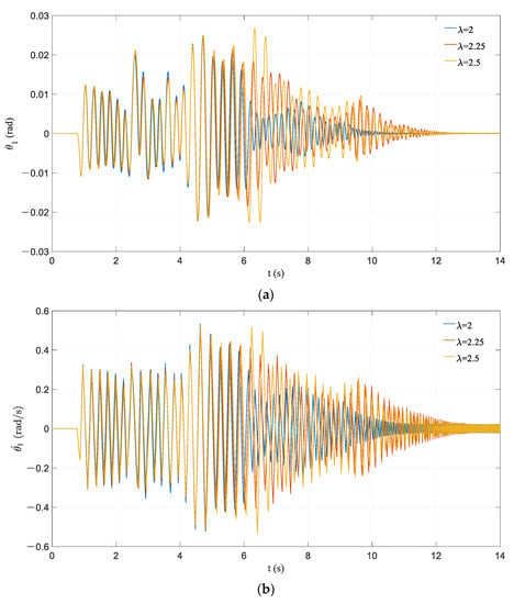 Effect of variation in λ: (a) time history of rocking rotation; (b) time history of angular velocity.